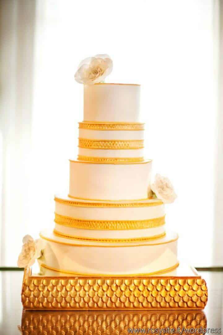 Such a stunning design and full of Tuscan charm and classic artisan inspiration. This gorgeous cake is a towering 5 tiers. The base icing is a classic ivory. The edges are gilded with metallic gold accents that are opulent and luxurious. The second and forth tier are embellished with embossed gold ribbon to match the […]